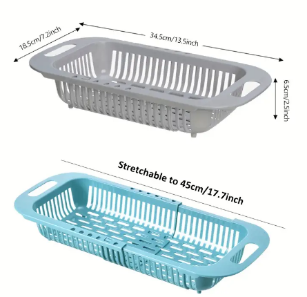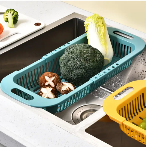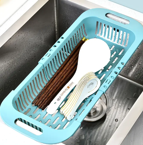 주방 싱크대에 걸쳐놓고 사용할 수 있는 플라스틱 바구니입니다.