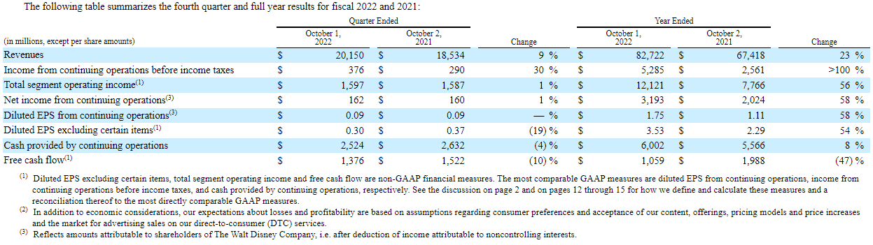 BURBANK, Calif. – The Walt Disney Company today reported earnings for its fourth quarter and fiscal year ended October 1, 2022